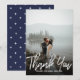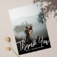 Modern and elegant wedding thank you vertical photo card featuring a white brushed handwritten script on the front "thank you" and a geometric black and white striped pattern on the back.