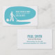 A modern and clean business card with a memorable asymmetric design and a white and blue iconic and stylised illustration in silhouette representing a cleaning professional. Print on both sides. On the back of the card a play with typography in crispy blue colour and grey. The blue in the palette is a bright light blue commonly associated with cleanliness and water in design branding.