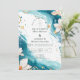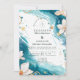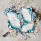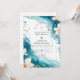 This wedding design features flowing watercolor waves in soft turquoise and deep ocean blue, accented with delicate seashells, starfish, and subtle gold details. The organic brushstroke layout creates movement and elegance while keeping the overall look light, modern, and refined.