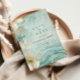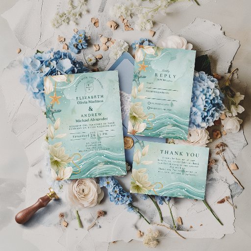 This modern wedding design features flowing watercolor waves in tranquil aqua and teal tones, paired with soft white florals, subtle seashell accents, and delicate gold details. The airy composition creates movement and depth while keeping the overall look refined, romantic, and contemporary.