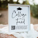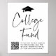 Modern graduation party sign featuring an illustration of a black graduation cap at the top with "College Fund" displayed in a black handwritten script. Personalise the graduation poster with custom text and a link to your desired payment service. The graduation party sign is perfect for displaying at your high school graduation party.