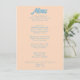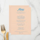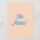 A colourful retro funky modern peach yellow wedding dinner menu. Which features chic template design of boho vintage peach background and blue bold typography. Perfect and matching with the whole suite.