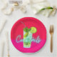 Colourful modern bar art features watercolor mojito cocktail in tall glass with "cocktails" in blue neon text on bright pink colorblock background