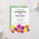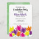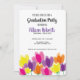 This is a girly, colourful, bright and modern graduation party invitation. Hot pink, purple yellow and orange flowers. The back of the invitation is green. Customisable text allows you to add your information. This invitation can be used for a graduation, birthday or any surprise party.