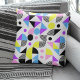 This modern pillow features colourful seamless geometric pattern with lines and shapes in yellow, blue, pink, purple, and black on white background.