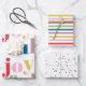 Add a splash of festive charm to your gift-giving with this joyful trio of holiday wrapping paper sheets: one features bold, multicolored typography that radiates cheer and celebration; another showcases vibrant, candy-striped lines for a classic yet playful look; and the third is sprinkled with adorable stars and hearts in a rainbow of hues, perfect for adding a sweet, whimsical touch to every present.