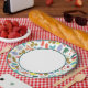 Colourful random scattered pattern of organic shapes in Flat Design style. Crescents, blobs, foliage, footprints and spots in trendy colours of red, green, blue, orange, yellow and gold. Modern Colourful Organic Patterned Green Border Large Paper Plates.