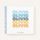 Modern personalised repeating name in a geometric font in fun, bright shades of blue and orange on a white background. There are 5 lines of text for shorter names (up to 7 or 8 characters depending on the letters). A fun personalised gift for yourself, friend, or loved one.