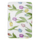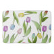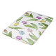 The product design features a pattern of colourful tulip flowers in purple, red, pink, blue, and yellow. This botanical illustration makes a modern and unique bath mat.