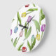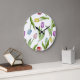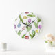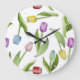 The product design features a pattern of colourful tulip flowers in purple, red, pink, blue, and yellow. This botanical illustration makes a modern and unique clock.