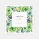 This square wedding napkin features a floral border of teal, green, and purple watercolor flowers and greenery. Personalise this colourful napkin with the names of the bride and groom and their wedding date.