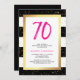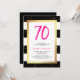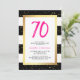 These glam, modern 70th birthday party invitations feature trendy black and white stripes with faux gold confetti and a matching frame, and bright pink typography at the top with her age.
