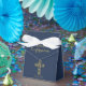 Modern confirmation favour box with a golden cross on a blue background and a hand lettered script name. Personalise with name, text and date.