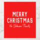 A classic Christmas Wine Label with a vibrant red colour. Featuring bold, modern white text that reads "Merry Christmas," alongside a personalised handwritten name or surname of the recipient, making it a thoughtful and unique touch for holiday gifting.