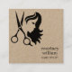 Custom Scissors & Face Silhouette Design Business Card for hair stylists on Kraft Paper. Stand out in style with this elegant square business card designed specifically for hair stylists and beauty professionals. Featuring a chic black silhouette of a woman's face alongside scissors and a comb, the front design instantly communicates your craft with sophistication. You can add your name and title for a personal touch, while the back includes all your essential salon details. Perfect for stylists, cosmetologists, and beauty entrepreneurs who want to make a memorable impression with every card they hand out.
