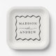 Add a stylish touch to your wedding reception, rehearsal dinner, engagement party, or wedding shower with these Modern Cream and Black Wavy Frame paper plates. The retro wedding paper plates display the couple's names in bold black lettering surrounded by a black wavy border contrasting with a light cream background. The trendy wedding paper plates were designed to coordinate with our Modern Wavy Frame wedding collection.
