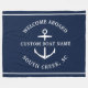 Nautical boating fleece blanket in navy blue reading "welcome aboard" as well as your custom boat name and location.