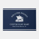 Nautical boating doormat in navy blue reading "welcome aboard" as well as your custom boat name and location.