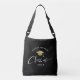 Modern custom name graduation crossbody bag with trendy script calligraphy reading CLASS of under a printed gold grad cap. Personalise with your name in an arch and the year of your graduation.