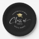 CONGRATULATIONS! Modern custom name graduation paper plate with trendy script calligraphy reading CLASS of under a printed gold grad cap. Personalize with your name in an arch and the year of your graduation.