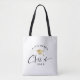 Modern custom name graduation tote bag with trendy script calligraphy reading CLASS of under a printed gold grad cap. Personalize with your name in an arch and the year of your graduation.