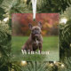 Modern Custom Name Photo Holiday glass ornament with your pet’s name in a bold white serif font.