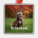 Modern Custom Name Photo Holiday metal ornament with your pet’s name in a bold white serif font.