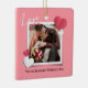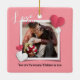 at christmass as a hanging decration for the chritmass tree.. its white porcline or cramic but very well made with added photo on one side.. also has a lovley red bag to keep it in.. execlent printed text in bold and black stands out well aganst the blue background of the photo.