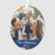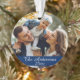 Personalise your holiday tree or home décor with a beautiful modern family themed acrylic ornament, featuring your family name and the year with your family photo on the front and back. This custom, unique design features an elegant calligraphy style font a holiday-blue stripe, all complimenting your families photo. The perfect housewarming addition to your holiday décor.