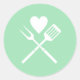 Modern round mint green and white sticker with BBQ utensils and a heart, matching the BABY-Q Invitations for a Baby Shower BBQ in my shop. Use this stickers to seal envelopes or favour bags.