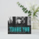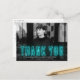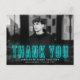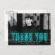 Modern graduation thank you postcard displaying the graduate's horizontal photo with "Thank You" in cyan neon lettering. Personalise the photo graduation thank you postcard by adding the graduate's name, school name, and graduation year. The graduation photo thank you postcard reverses to display your return address and typed thank you message (leave blank to handwrite your own).