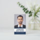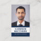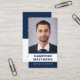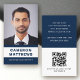 White and dark blue or custom colour, modern, professional business card design with template fields for name, company name/title, photo, QR code and contact information. Change background colour, move and resize elements with the customisation tool.