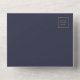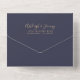 The left-hand edge of this elegant modern all-in-one wedding invitation and RSVP features a gold faux glitter border. The customisable text combines gold-coloured whimsical handwriting, copperplate and italic fonts on a dark blue background. The return address appears on the outside flap and the reverse side of the detachable RSVP card in gold-coloured text on solid dark blue.