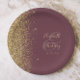 The left-hand edge of these elegant modern wedding paper plates features a gold faux glitter design. Personalise them with the names of the bride and groom in pale gold-coloured handwriting script over a large ampersand on a dark burgundy background, with the wedding date below.