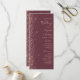The left-hand edge of this elegant modern wedding program features a rose gold faux glitter design. The customisable text combines rose pink handwriting, copperplate and italic fonts on a dark burgundy background.