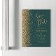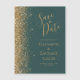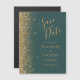 The left-hand edge of this elegant modern wedding save the date magnetic card features a gold faux glitter border. The customisable text combines pale gold-coloured handwriting, copperplate and italic fonts on a dark green background.