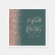 The left-hand edge of these elegant modern wedding napkins features a rose gold faux glitter design. The customisable text combines rose pink handwriting and copperplate fonts over a large ampersand on a dark green background.