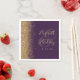 The left-hand edge of these elegant modern wedding napkins features a gold faux glitter design. The customisable text combines pale gold coloured handwriting and copperplate fonts over a large ampersand on a dark purple background.