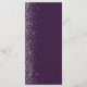 The left-hand edge of this elegant modern wedding menu features a silver faux glitter design. The customisable text combines silver grey handwriting, copperplate and italic fonts on a dark purple background. The reverse side features a matching purple and silver glitter design.