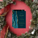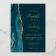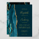 The left-hand edge of this elegant modern wedding invitation features a teal blue watercolor agate border trimmed with faux gold glitter. The customisable text combines handwriting, copperplate and italic fonts in real gold foil on a dark teal background. The reverse side features a matching teal and gold agate design.