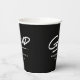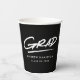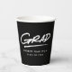 Modern graduation paper cups featuring "Grad" displayed in white, handwritten lettering with a dashed underline on a black background (or colour of your choice). Personalise the black and white graduation paper cups by adding the graduate's name and graduation year. The design repeats on the back. The personalised graduation paper cups are perfect for both high school and college graduation parties!