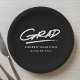 Modern graduation paper plates featuring "Grad" displayed in white handwritten lettering with a dashed underline on a black background. Personalise the black and white graduation paper plates by adding the graduate's name and graduation year. The personalised graduation paper plates are perfect for both high school and college graduation parties!