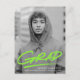 Modern graduation party invitation postcards featuring the graduate's vertical senior photo with "Grad" in lime green handwritten lettering with an underline dash below. Personalise the front of the photo graduation party postcard by adding the graduate's name, school name, and graduation year. The postcard reverses to display your return address and graduation party details.