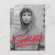 Modern graduation party invitation postcards featuring the graduate's vertical senior photo with "Grad" in red handwritten lettering with an underline dash below. Personalise the front of the photo graduation party postcard by adding the graduate's name, school name, and graduation year. The postcard reverses to display your return address and graduation party details.