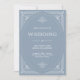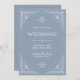 These glamourous wedding invitations feature a modern spin on classic art deco. An ornate, white geometric frame and ornamentation decorate an elegant dusty blue background for a dramatic, vintage wedding look. The back has room for additional wedding guest details, plus a scannable QR code so guests can RSVP and respond online at your wedding website.