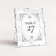 These glamourous black and white wedding table numbers feature a modern spin on classic art deco. An ornate, black geometric frame and ornamentation decorate an elegant white background for a dramatic, vintage wedding look.