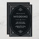 These glamourous wedding invitations feature a modern spin on classic art deco. An ornate, white geometric frame and ornamentation decorate an elegant dark onyx black background for a dramatic, vintage wedding look. The back has room for additional wedding guest details, plus a scannable QR code so guests can RSVP and respond online at your wedding website.