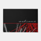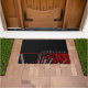 Welcome doormat features a stylish modern organic abstract design of white and grey ribbons with red accents on a black background. The top half the doormat features a simple plain black background with the custom welcome message in a modern script in lower case. The bottom half of the doormat features the white and grey ribbons with red accents on a black background.