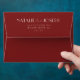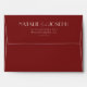 A retro modern hand written bright colorful wedding envelope. Which features bold bride and groom's names in cream color. And personalized return address. On deep red color background. Which suits the whole wedding suite.