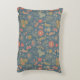 This throw pillow features stylised flowers in shades of coral and olive green on a denim blue background.
